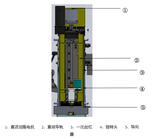 主轴滑块由直流伺服电机通过同步带传动带动丝杠螺母完成上下运动。主轴滑块采用双V直线导轨。 主轴头内部装有上、下两个限位开关,以限定主轴滑块运动的上限位置和下限位置。 2二次行程 二次行程安装在立柱与主轴头之间,其结构见图5.3。
