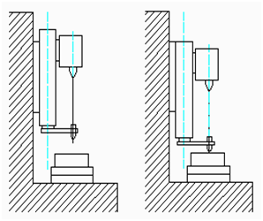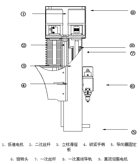 在低速大扭距电机的驱动下经由丝杆使整个主轴头上下移动,这样可以调整导向器与工件间的最佳距离,见图5.3,在侧面有锁紧手柄,一旦调整好二次行程的位置后,就应锁紧手柄,以免加工时产生不必要的移动,而运动时必须放松。