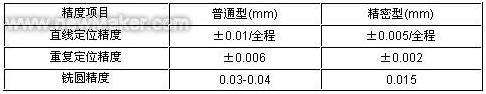 加工中心的精度分类为普通型和精密型,其主要精度项目见下表: 加工中心主要精度项目  用户根据工件的加工精度要求,选用相应精度等级的机床,批量生产的零件,实际加工出的精度数值可能是定位精度的1.5-2倍。普通型机床批量加工8级精度工件,精密机床加工精度可达5-6级,但要有恒温等工艺条件,所以精密型机床使用严格,价格高。